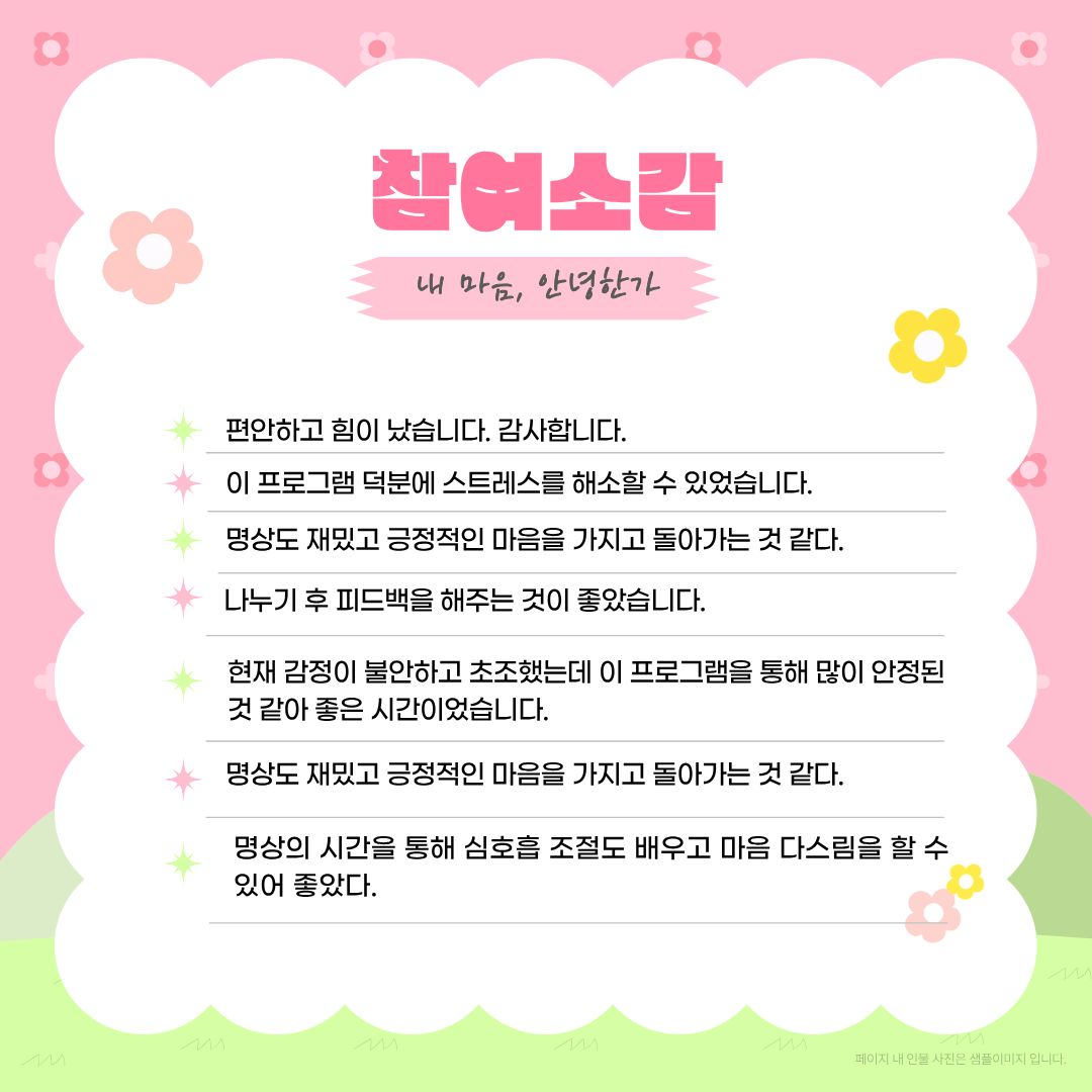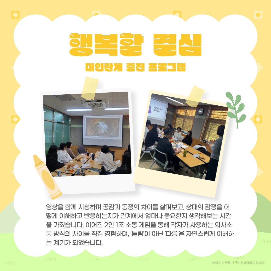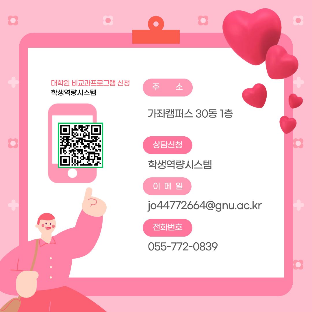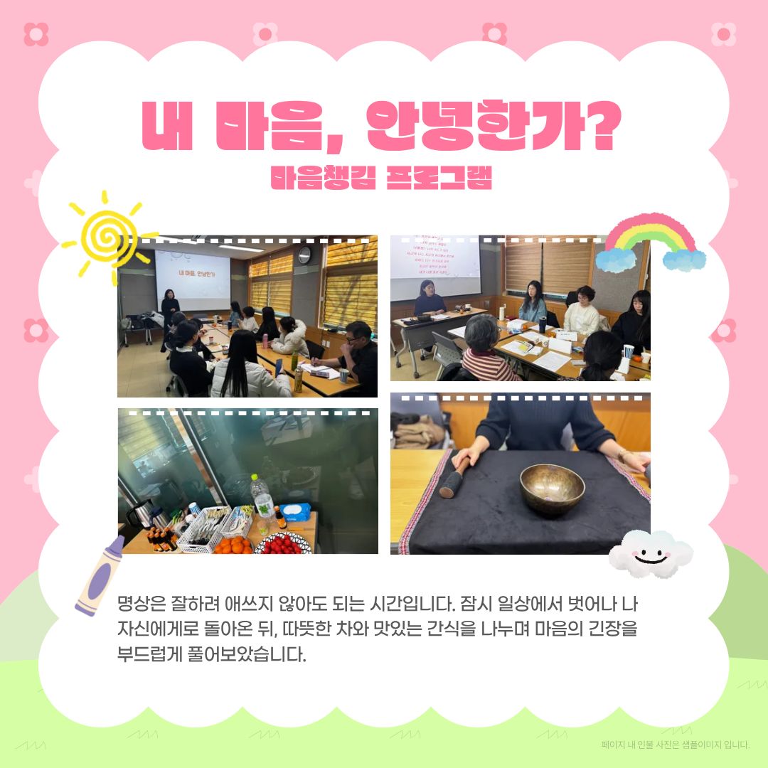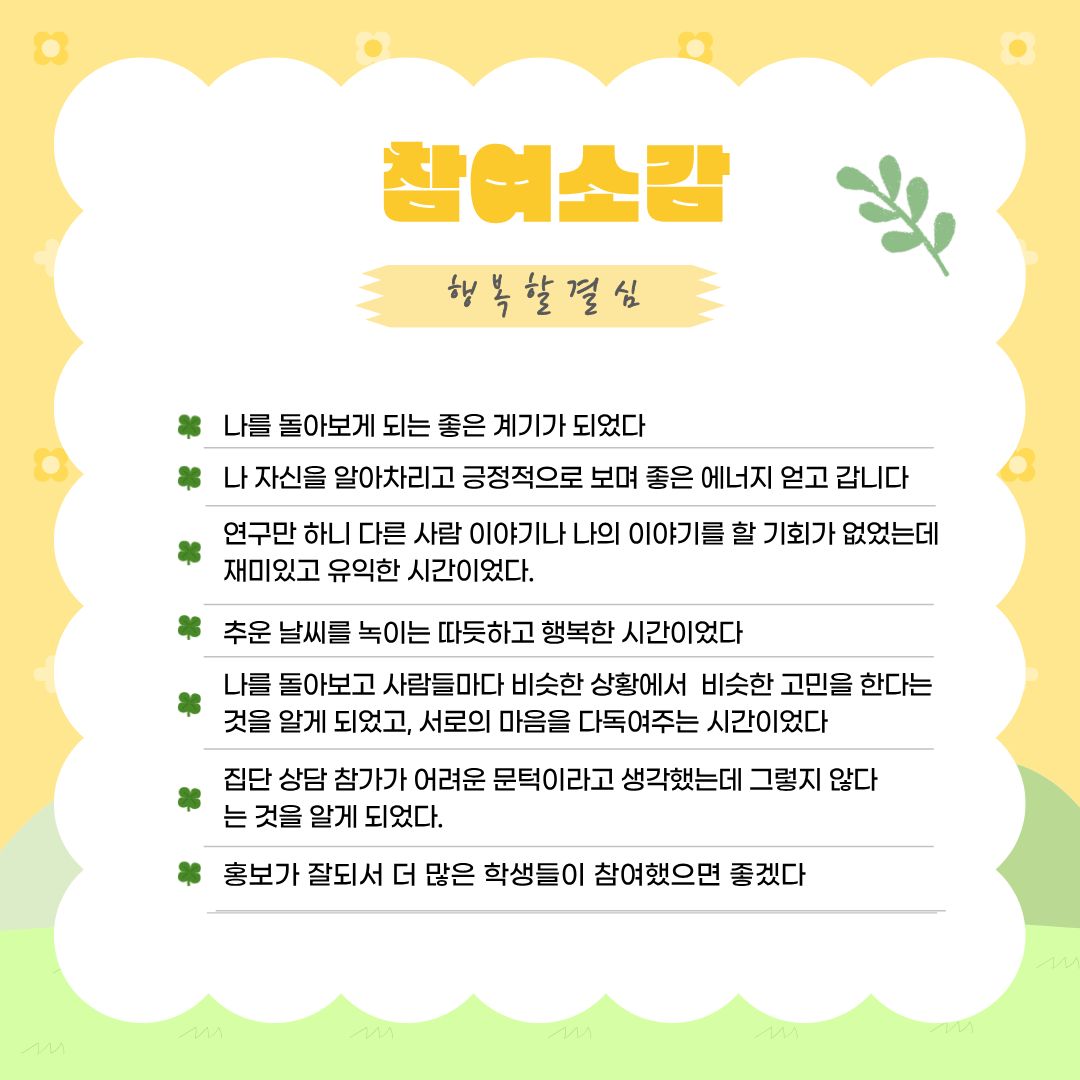 Korean | 2025년 2학기 대학원 프로그램 운영 페이지 정보 작성자 학생상담센터 작성일26-01-06 16:50 조회804회 댓글0건 관련링크 다음글 목록 본문 2025년 2학기 대학원 집단 프로그램'마음회복, 관계성장'을 진행하였습니다.2026년에도 대학원 프로그램에 많은 관심과 참여 바랍니다. 댓글목록 등록된 댓글이 없습니다. 다음글 목록