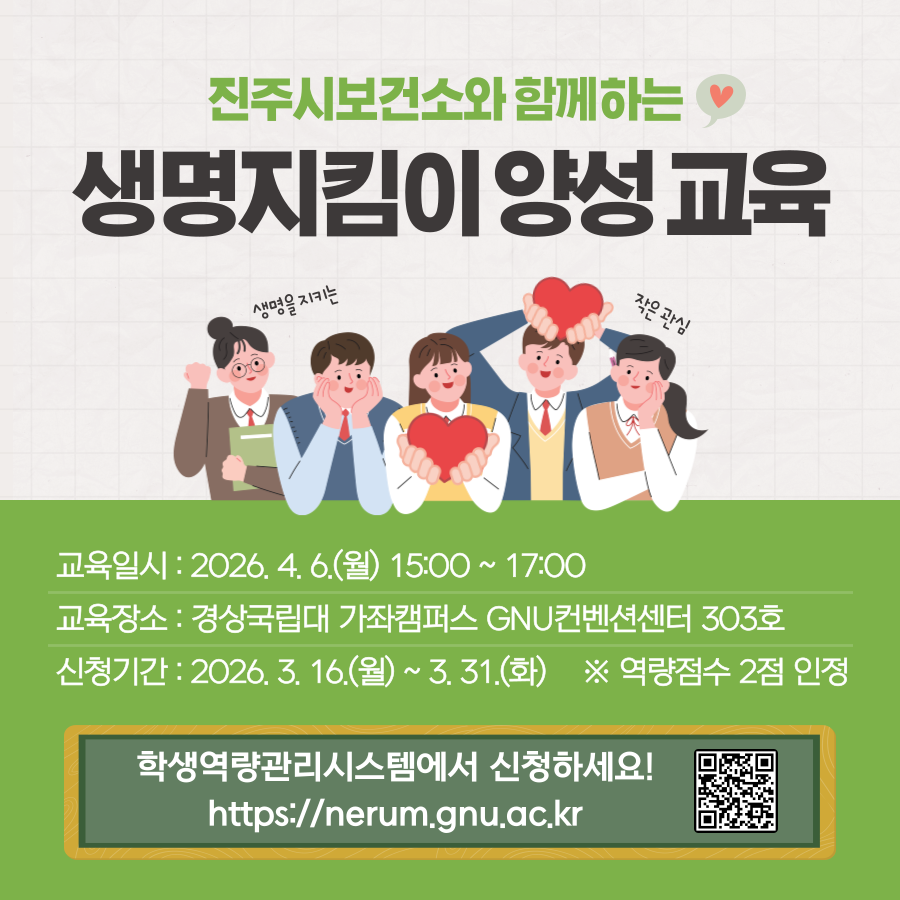 진주시 보건소와 함께 다음과 같이 생명지킴이 양성 교육을 실시합니다.