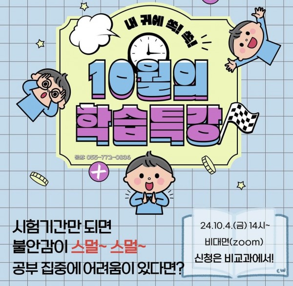 Korean | 2024년도 학습특강 안내 (10월) 페이지 정보 작성자 학생상담센터 작성일25-09-15 11:18 조회183 회 댓글0 건 관련링크 이전글 다음글 목록 본문 2024년도 학습특강 안내 (10월) 입니다. 댓글목록 등록된 댓글이 없습니다. 이전글 다음글 목록