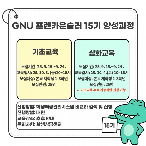 Korean | GNU 프렌카운슬러 15기 양성과정 페이지 정보 작성자 학생상담센터 작성일25-09-15 21:44 조회219 회 댓글0 건 관련링크 이전글 다음글 목록 본문 댓글목록 등록된 댓글이 없습니다. 이전글 다음글 목록