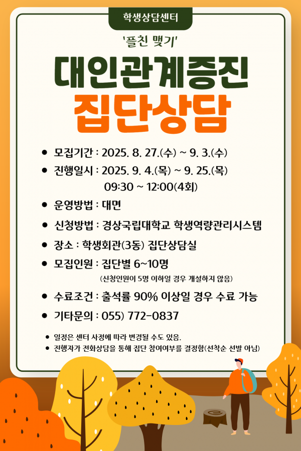 공지 | 2025학년도 2학기 대인관계증진 집단상담 구성원을 모집합니다. 페이지 정보 작성자 학생상담센터 작성일25-08-29 17:07 조회354 회 댓글0 건 관련링크 이전글 다음글 목록 본문 2025학년도 2학기 대인관계증진 집단상담 구성원을 모집합니다. 댓글목록 등록된 댓글이 없습니다. 이전글 다음글 목록