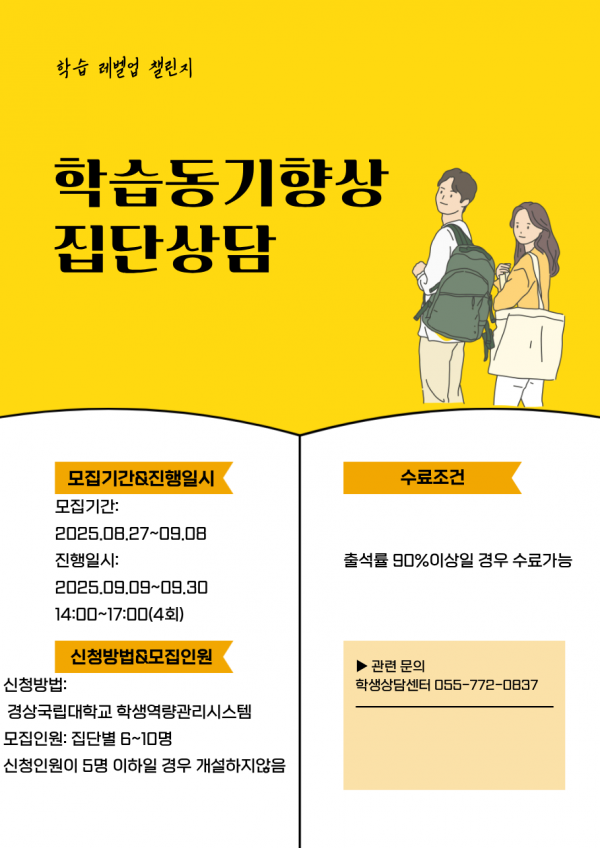 공지 | 2025학년도 2학기 학습동기향상 집단상담 구성원을 모집합니다. 페이지 정보 작성자 학생상담센터 작성일25-08-29 17:10 조회353 회 댓글0 건 관련링크 이전글 다음글 검색 목록 본문 2025학년도 2학기 학습동기향상 집단상담 구성원을 모집합니다. 댓글목록 등록된 댓글이 없습니다. 이전글 다음글 검색 목록