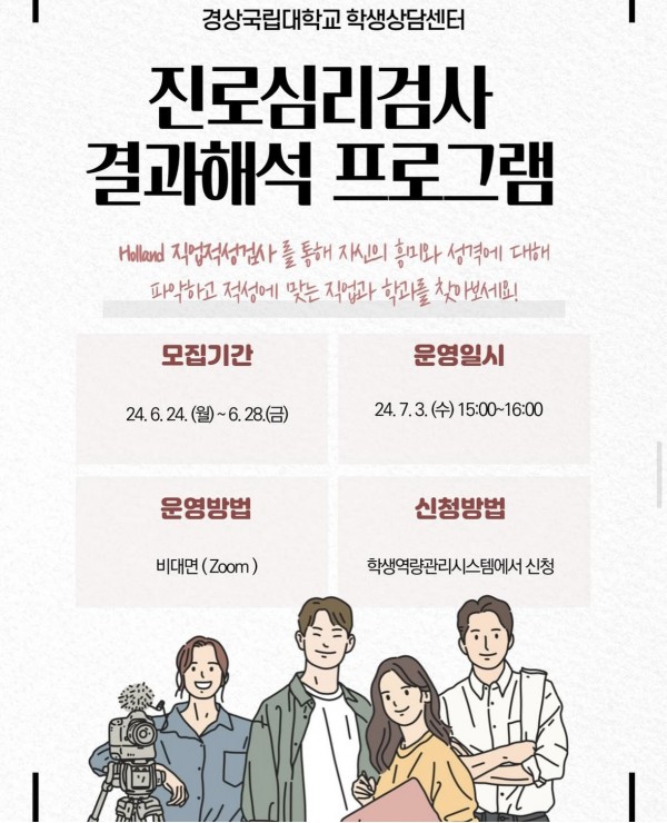 공지 | 2024년도 진로 단체심리검사(Holland 직업적성검사) 모집 안내 페이지 정보 작성자 학생상담센터 작성일25-09-15 09:31 조회192 회 댓글0 건 관련링크 이전글 다음글 검색 목록 본문 댓글목록 등록된 댓글이 없습니다. 이전글 다음글 검색 목록