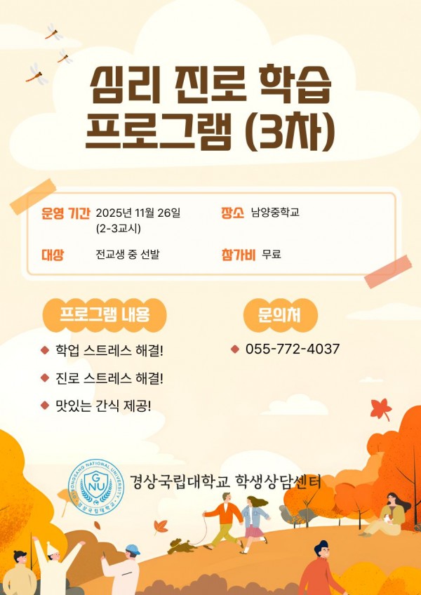 Korean | 2025학년도 심리진로학습 프로그램(3차) 페이지 정보 작성자 학생상담센터 작성일25-11-05 16:15 조회165 회 댓글0 건 관련링크 이전글 다음글 목록 본문 . 댓글목록 등록된 댓글이 없습니다. 이전글 다음글 목록