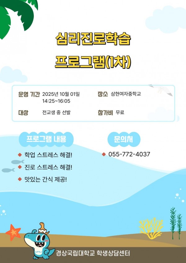 Korean | Korean | 2025학년도 심리진로학습 프로그램(1차) 페이지 정보 작성자 학생상담센터 작성일25-11-05 16:28 조회155 회 댓글0 건 관련링크 이전글 다음글 목록 본문 . 댓글목록 등록된 댓글이 없습니다. 이전글 다음글 목록