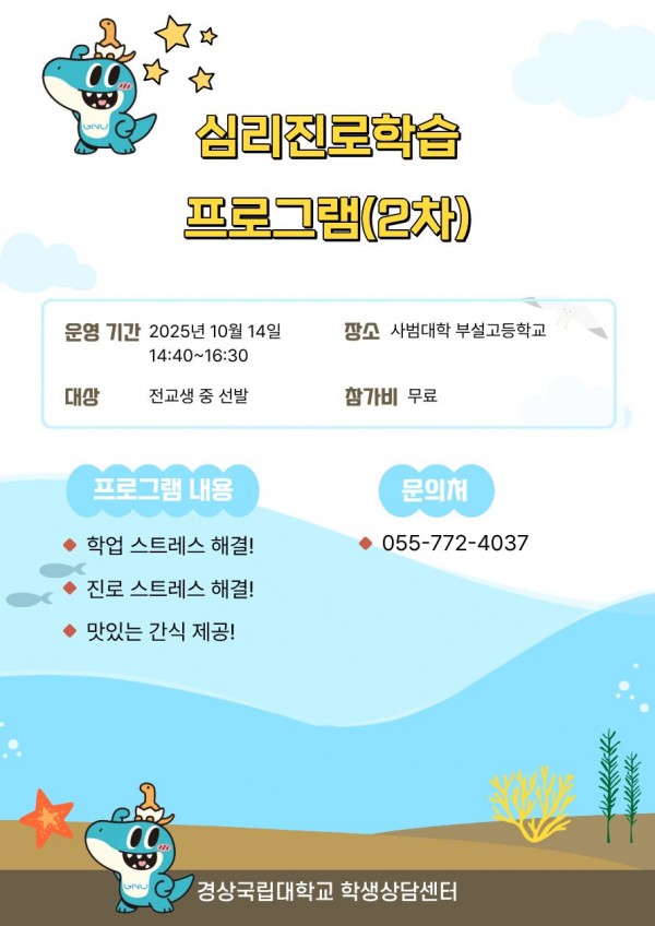 Korean | 2025학년도 심리진로학습 프로그램(2차) 페이지 정보 작성자 학생상담센터 작성일25-11-05 16:29 조회138 회 댓글0 건 관련링크 이전글 다음글 목록 본문 . 댓글목록 등록된 댓글이 없습니다. 이전글 다음글 목록