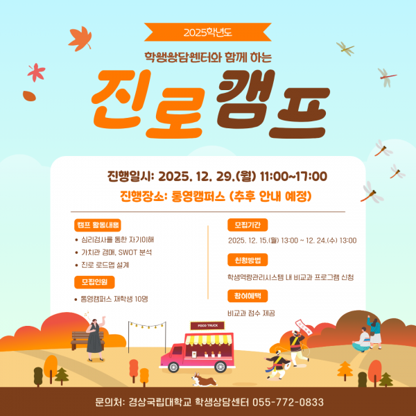 공지 | 2025학년도 진로 심리상담 캠프(통영캠퍼스) 모집 안내 페이지 정보 작성자 학생상담센터 작성일25-12-17 16:00 조회161 회 댓글0 건 관련링크 이전글 다음글 목록 본문 댓글목록 등록된 댓글이 없습니다. 이전글 다음글 목록