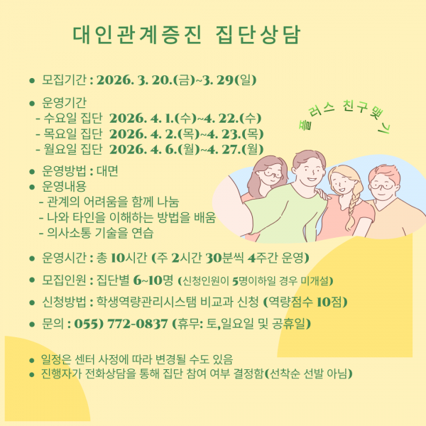 Korean | 2026학년도 1학기 대인관계증진 집단상담'플친 맺기' 페이지 정보 작성자 학생상담센터 작성일26-03-21 12:53 조회77 회 댓글0 건 관련링크 이전글 다음글 목록 본문 2026학년도 1학기 대인관계증진 집단상담 구성원을 모집합니다. 댓글목록 등록된 댓글이 없습니다. 이전글 다음글 목록