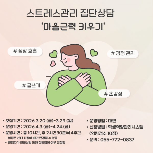 Korean | 2026학년도 1학기 스트레스관리 집단상담'마음근력 키우기' 페이지 정보 작성자 학생상담센터 작성일26-03-21 12:55 조회73 회 댓글0 건 관련링크 이전글 다음글 목록 본문 2026학년도 1학기 스트레스관리 집단상담 구성원을 모집합니다. 댓글목록 등록된 댓글이 없습니다. 이전글 다음글 목록