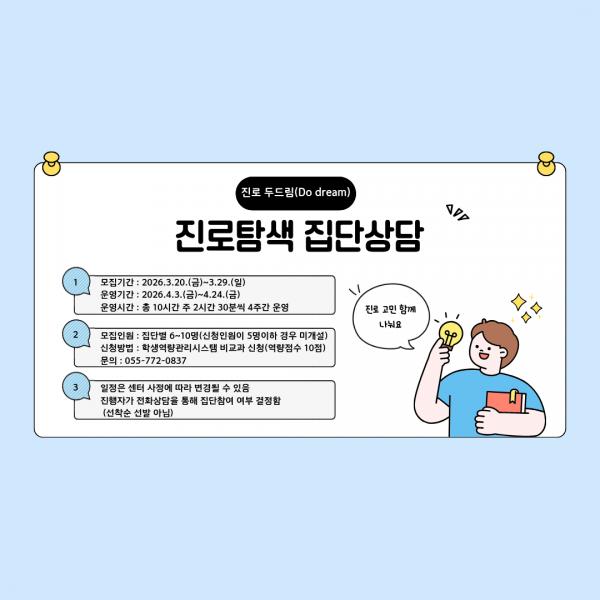 Korean | 2026학년도 1학기 진로탐색 집단상담 '진로 두드림(Do dream)' 페이지 정보 작성자 학생상담센터 작성일26-03-21 12:57 조회98 회 댓글0 건 관련링크 이전글 다음글 목록 본문 2026학년도 1학기 진로탐색 집단상담 구성원을 모집합니다. 댓글목록 등록된 댓글이 없습니다. 이전글 다음글 목록